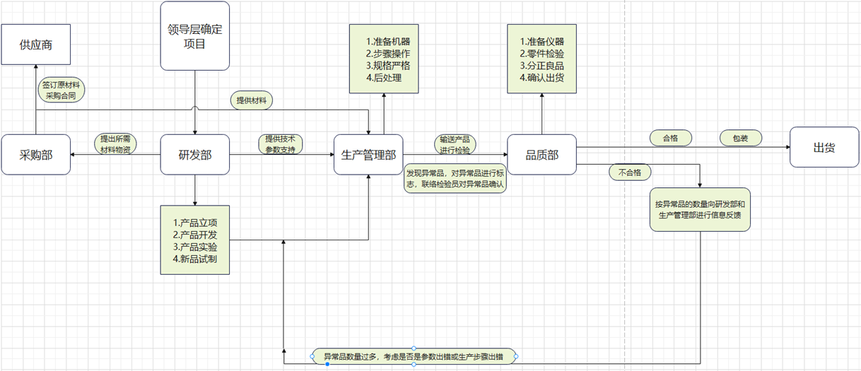 确立项目-研发部-采购部-供应商-生产管理部-品质部-出库